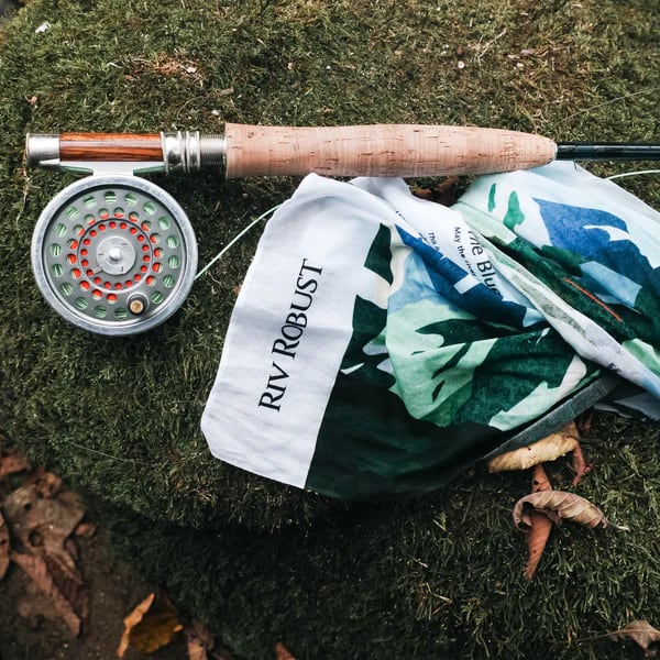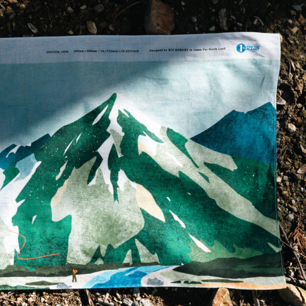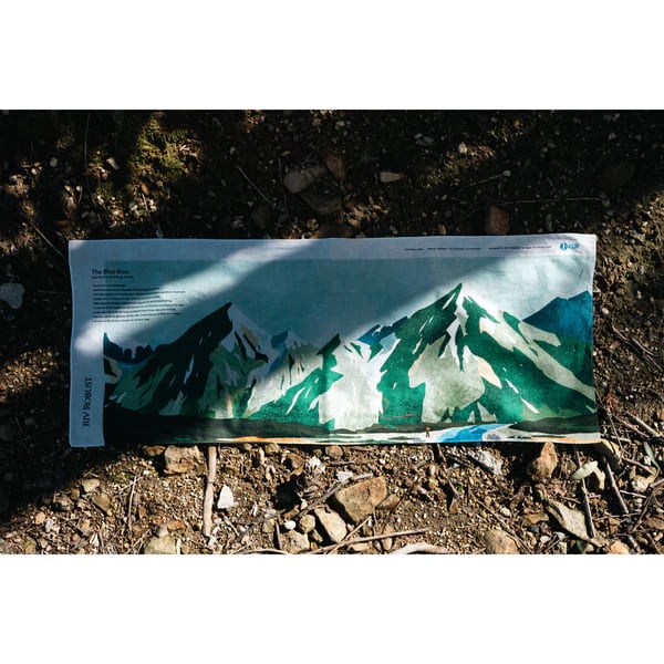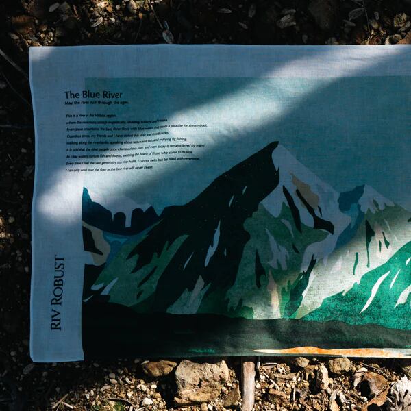 This hand towel is imbued with memories of mountains, water, and the land itself, recalling days spent walking along mountain streams with friends. Look closely and you'll spot a fly fisher casting his rod—one of my favorite details.